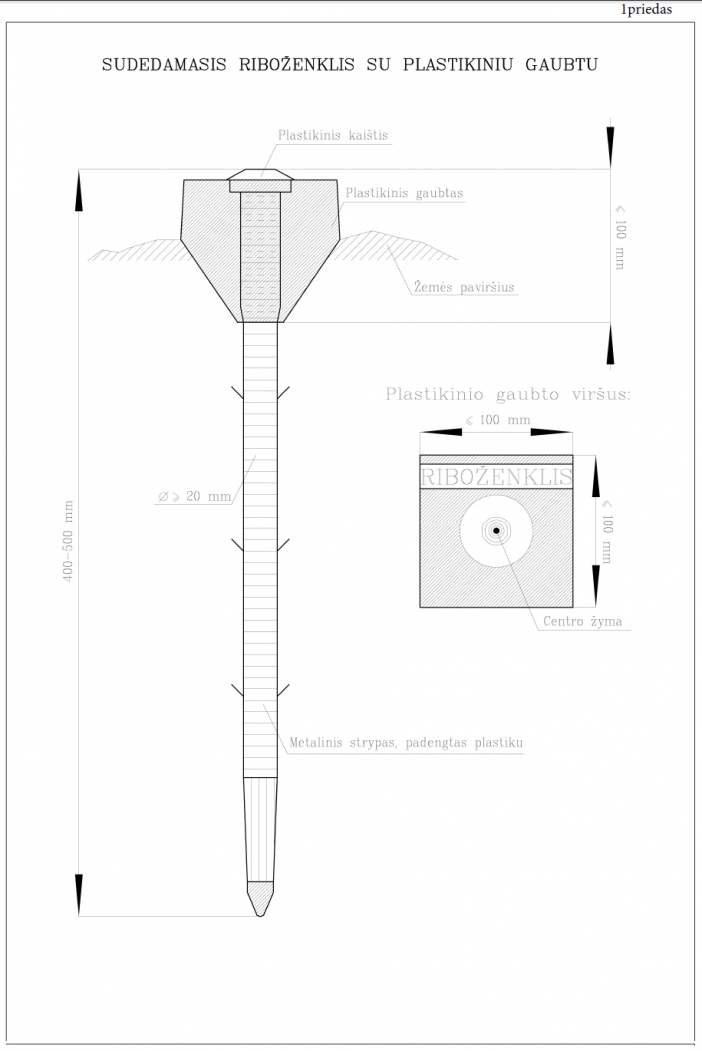 5.1. metalinis, 400–600 mm aukščio strypas su plieniniais inkarais ir plastikiniu antgaliu apatinėje dalyje ir perdirbto plastiko gaubtu su centro žyma viršutinėje dalyje;