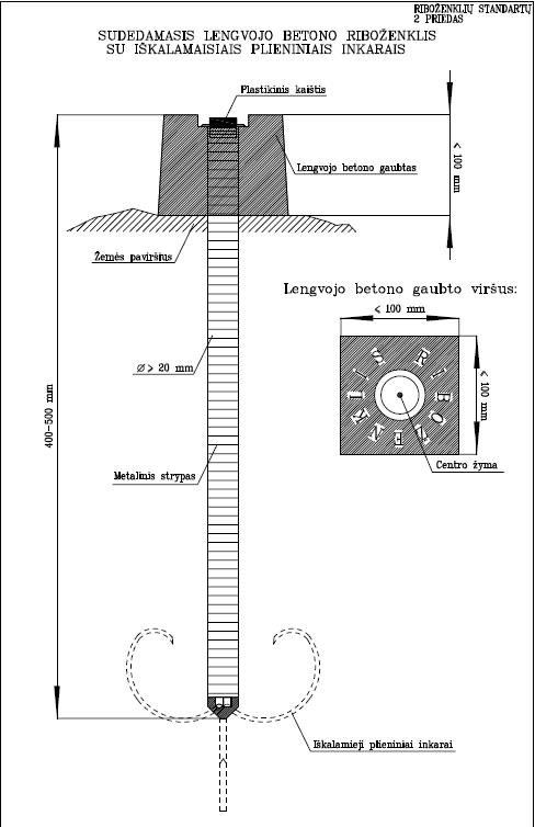 2.1. metalinis, tuščiaviduris, 400–500 mm aukščio strypas su 2 arba 3 iškalamaisiais plieniniais inkarais apatinėje dalyje, lengvojo betono gaubtu ir plastikiniu kaiščiu su centro žyma viršutinėje dalyje;