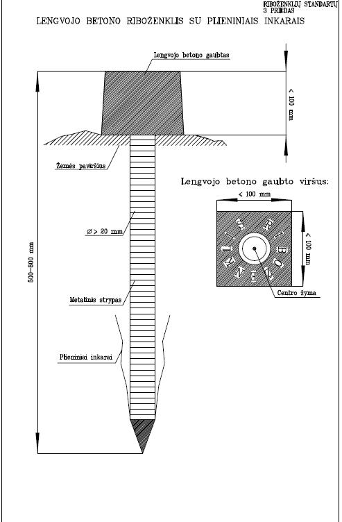 3.3. ženklinimo metu šis riboženklis vertikaliai visu aukščiu įtvirtinamas iki žemės paviršiaus arba lengvojo betono gaubtą paliekant virš žemės paviršiaus.