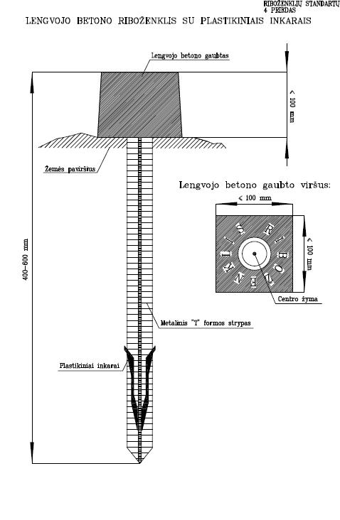 4.3. ženklinimo metu šis riboženklis vertikaliai visu aukščiu įtvirtinamas iki žemės paviršiaus arba lengvojo betono gaubtą paliekant virš žemės paviršiaus.