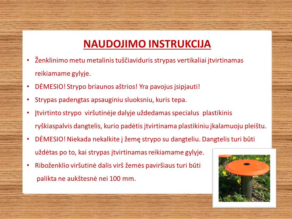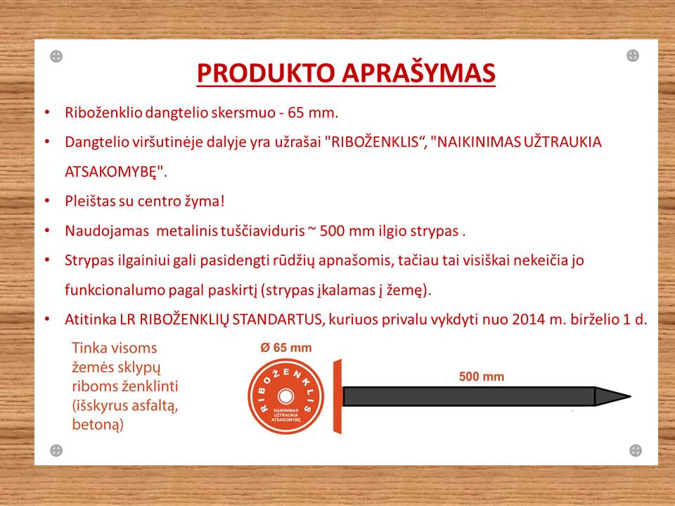 Siūlome įsigyti mūsų įmonėje gaminamus RIBOŽENKLIUS, atitinkančius 2014-01-21 įsigaliojusias Žemės sklypo ribų ženklinimo taisykles ir Riboženklių standartus.